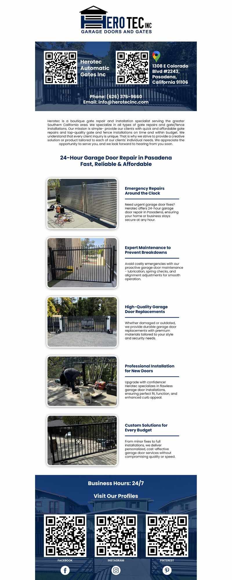 When garage door issues strike unexpectedly, Herotec’s 24-hour garage door repair service is just a call away. Based in Pasadena, they offer prompt emergency service as well as scheduled maintenance, replacements, and installations. Their skilled team works with all major garage door brands and provides transparent pricing with no after-hours fees. Your safety and satisfaction are their top priorities. Every repair is backed by a 12-month warranty, ensuring long-term peace of mind. With same-day availability and flat-rate quotes, Herotec delivers fast, honest service you can count on.